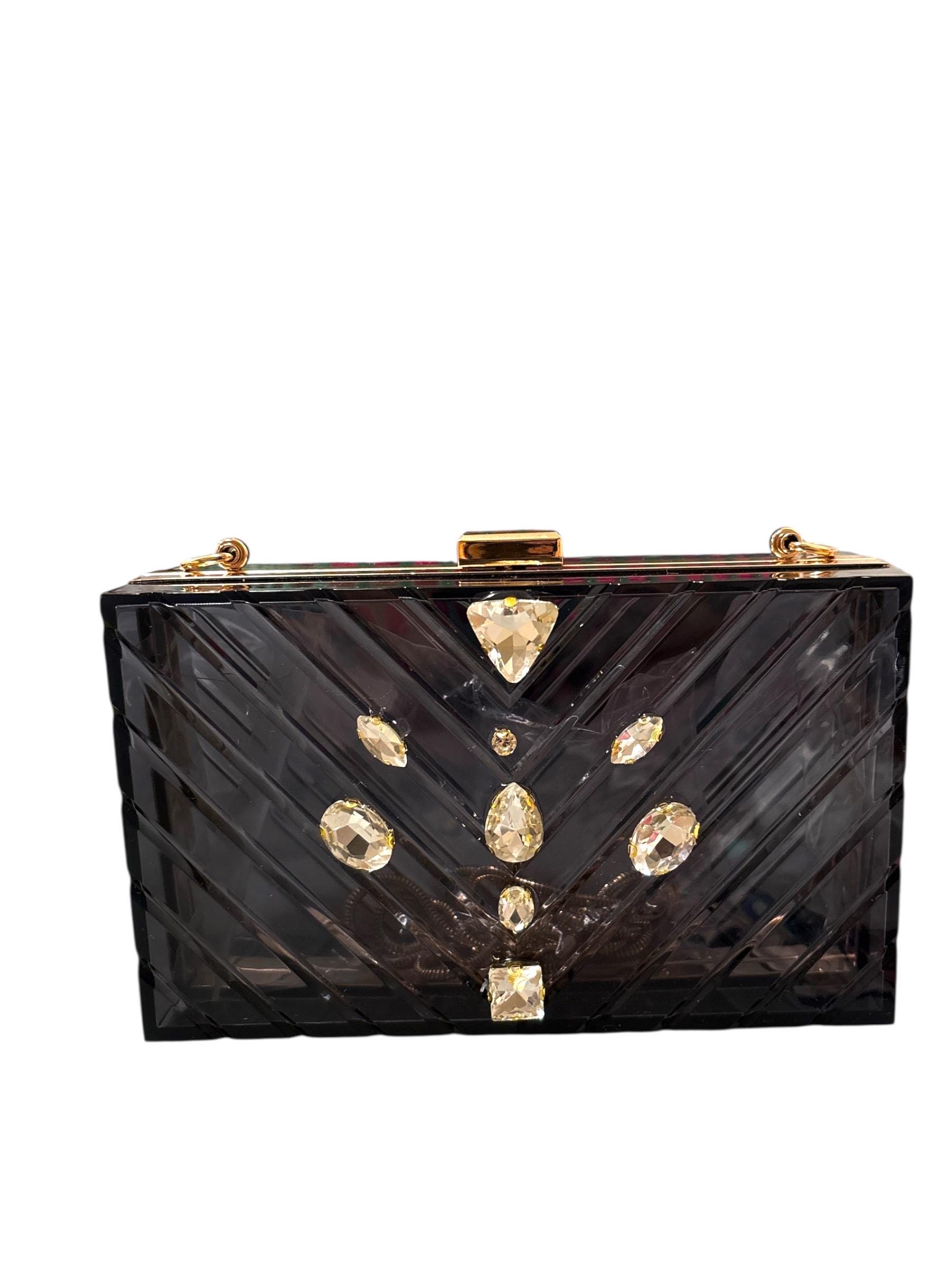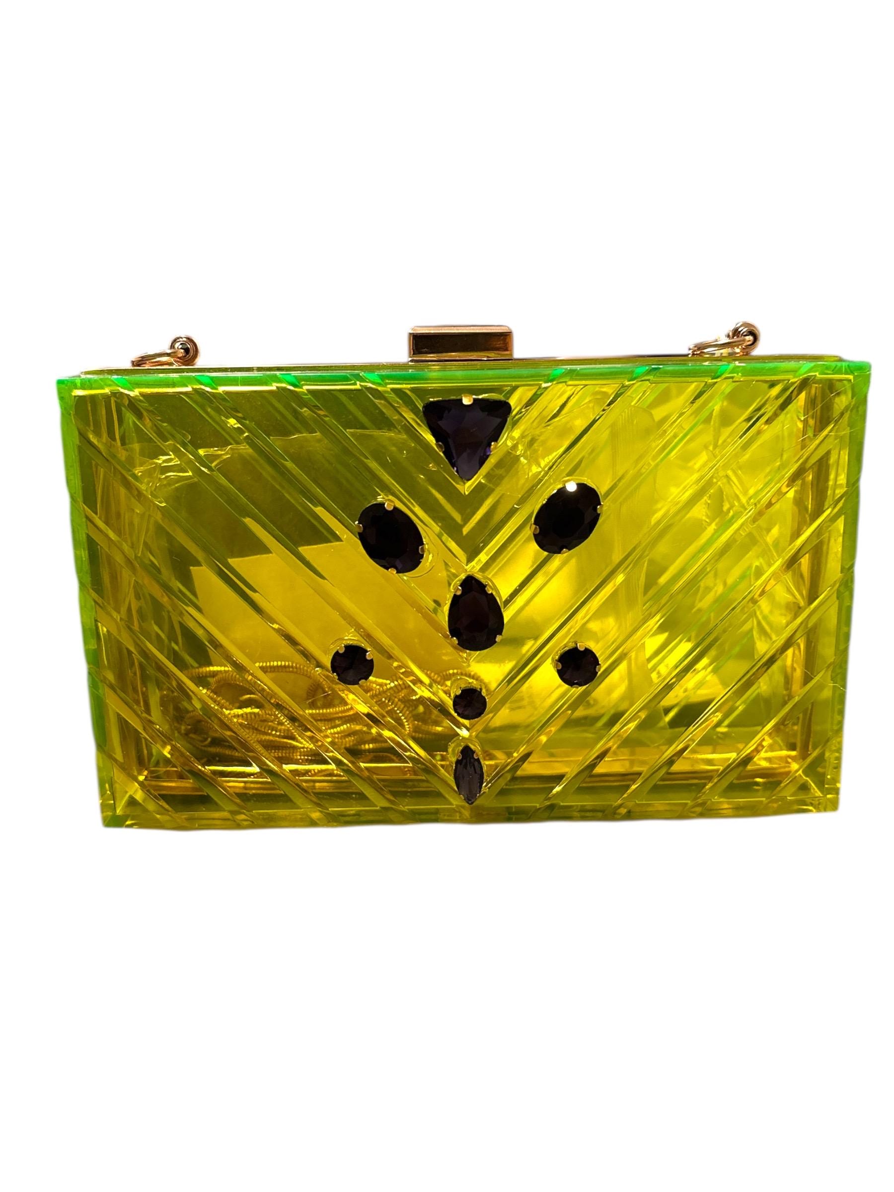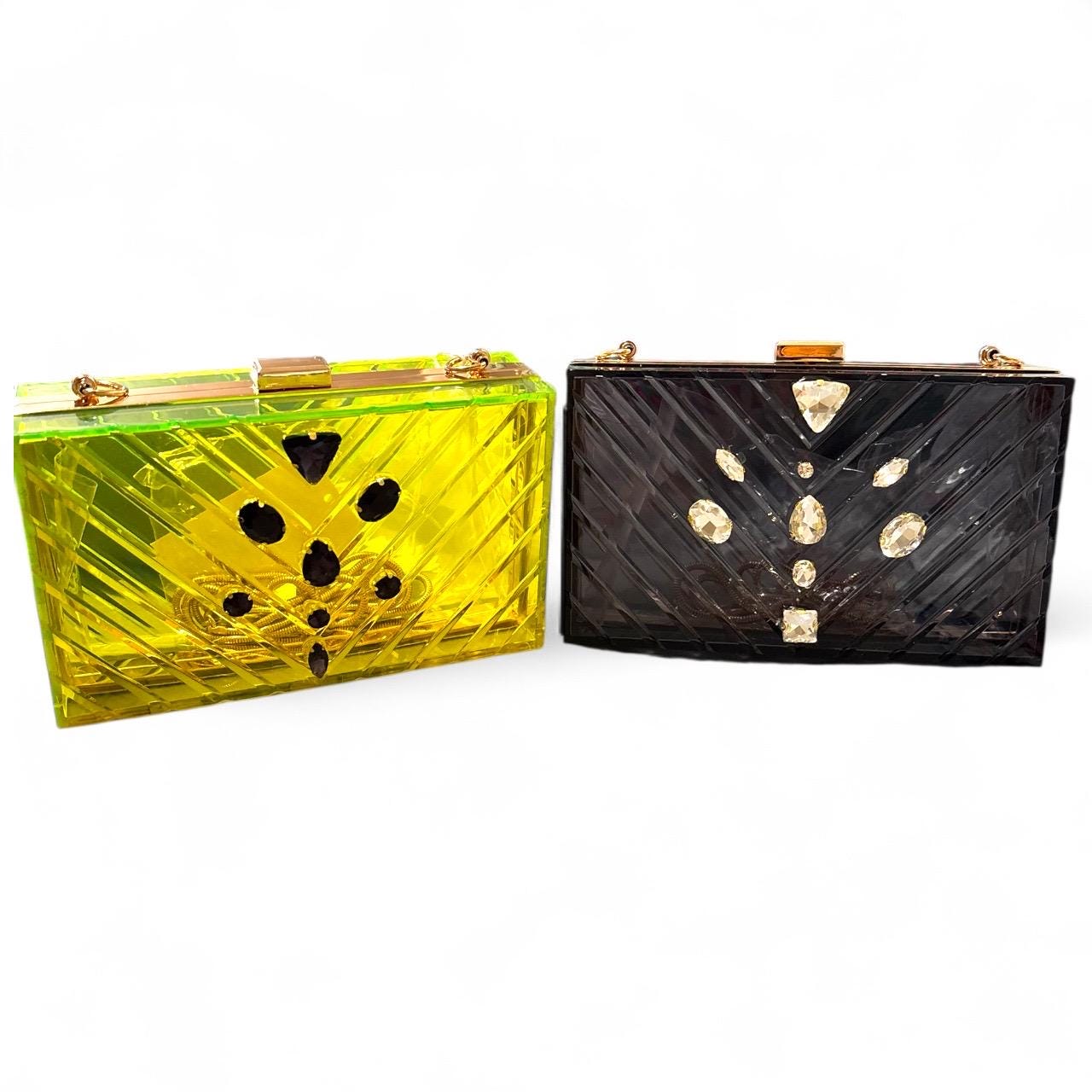 Clear colored acrylic CLUTCH BAG with rhinestones gold clasp and gold shoulder strap chain - neon yellow bag with purple rhinestones and black acrylic bag with diamond rhinestones
